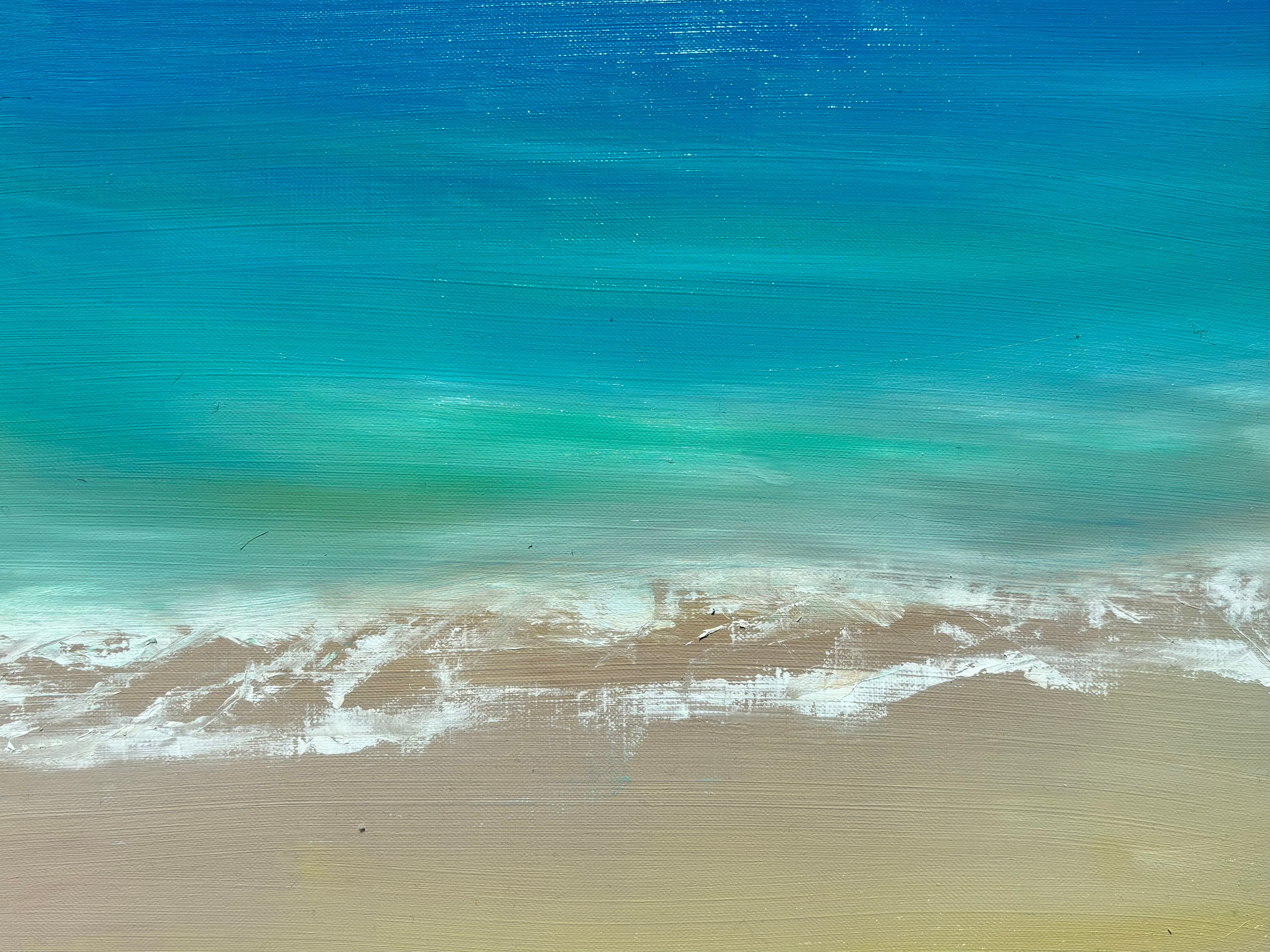 P8サイズ(455mm×333mm)のキャンバスです。 白んだ砂浜に打ち寄せる、青い青い海の表情を塗り込みました。青とグリーンを混ぜながら、素朴だけど心に長く残る絵を目指しています。海の輝きが、自分の心の奥に続く扉になるような、そんな気持ちで描きました。