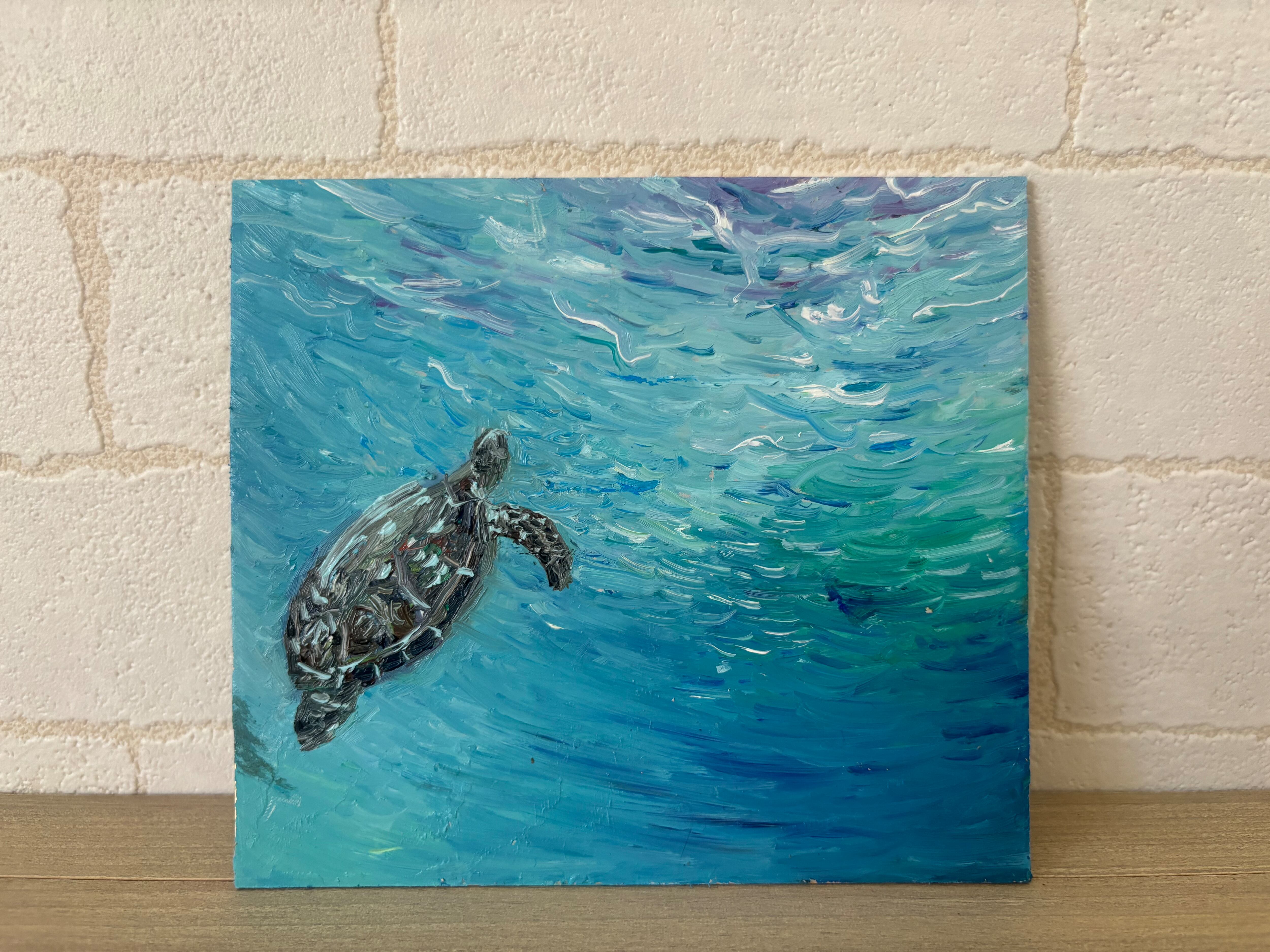 下地材でコーティングしたミニ色紙(136mm 121mm)に、油彩画で描いた作品です。明るい水面の光へ向かってウミガメが泳いでいく様子です。海は青く透明でとても気持ちがよさそうです。